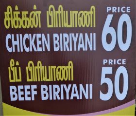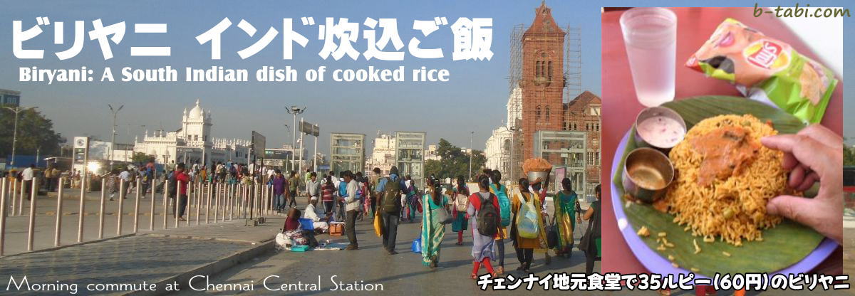 ビリヤニとはインドの炊込みご飯。チェンナイなど南インドの定番庶民食。ムガル帝国時代(1526年~1858年)宮廷料理だったが、現在は地元食堂で60円で食べられる安価な地元食堂メニュー。安くてそこそこおいしい。炊き込みで炒めてないのでチャーハンではないのだがイメージ的には独特の味のインドチャーハンという感じ。タミル語表示は