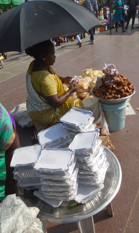 チェンナイ地元食堂で。デフォでごはんがビリヤニ状態の地元定食。カレーは脇のポットにあってかけ放題。スプーンは言えばくれるが、せっかくなので地元の方と同じ仕様で食べる。