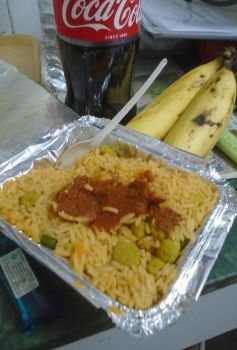 マリーナビーチ前で買ったビリヤニ弁当は20Rp(34円)うまかった。2020年2月2日撮影。パンデミック直前当時レートで30円。