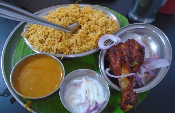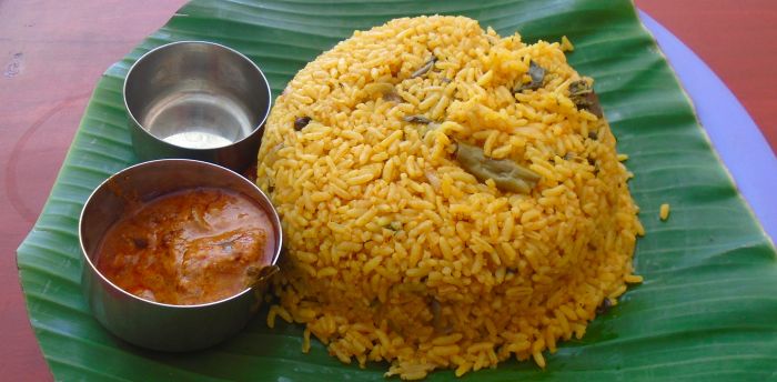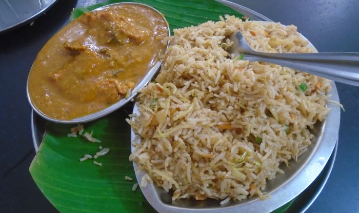 ビリヤニ biryani பிரியாணி 35ルピー 60円 手で食べる。スプーンくれといえばくれるのだけれど。バナナの葉っぱが味あり。