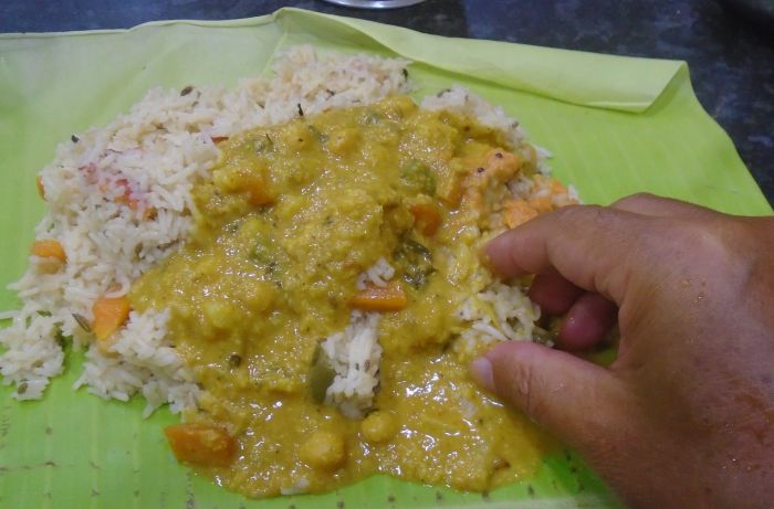 クミンやターメリックなどインド独特のスパイスがきいていて、おいしいことはおいしいが、チキンマサラのような強烈なうまさはなく、安価で無難に腹が膨らむ庶民定番メニュー。現地では基本手で食べる。チキンマサラ頼むとデフォでごはんがビリヤニだったりもする。地元定食屋によってはごはんやカレー食べ放題で「いらない」というまで延々追加で店員が盛ってくる異次元世界。