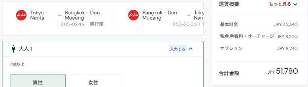 エアジャパン成田バンコク片道2万90円で確保。燃油税、空港税、クレカ手数料込。受託荷物なし、座席指定なし、機内食なしのミニマムフライト