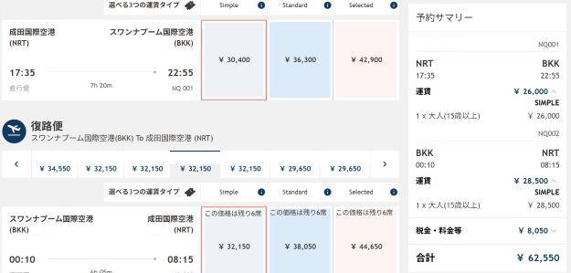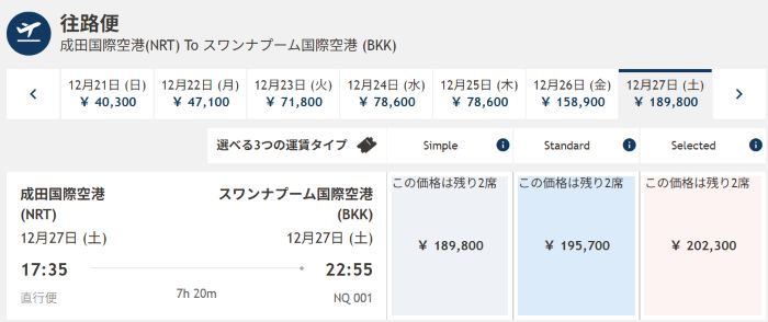 9月以降ZIPAIRがバンコクプロモ片道16,500円とか広告出しているも実質その値段で確保できない。表示されるのはほぼ2~3万円台。またこういう格安プロモ料金の場合、往路を1万円台で確保できても復路が高くなる傾向あり、往復ではそこそこな料金になる場合がほとんど。