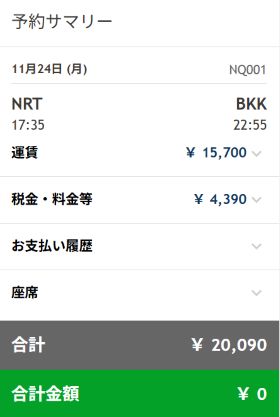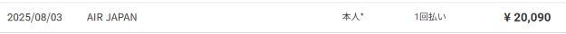 2025年8月3日に確保した成田バンコク片道20,090円のエアジャパンフライト。