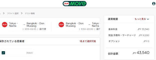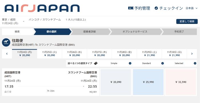 2025年8月3日確保の成田バンコク片道20,090円~。預け荷物なしの場合。エアジャパンは2026年3月末で運航を休止とのこと。
