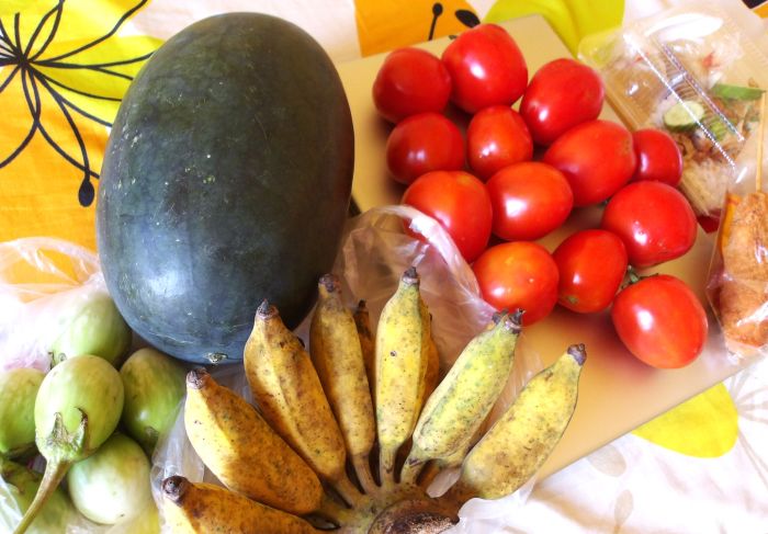 - カウマンガイ弁当20 チキンカツ弁当20 スイカ30 トマト1kg35 マクーア6個10 バナナ小14本10 チキン串カツ2本20 ミーシュエソフトクリーム15 ごはん8