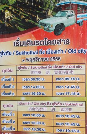 行きは問題なく快適にチェンマイ行のバス途中下車で遺跡入場門徒歩5分の乗場におろされ快適に遺跡訪問することができた。近くにバス乗場にもなっているツアー会社があるのでそこで帰りのバスの時間もチェックした。14時と18時発とのこと。