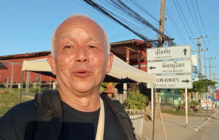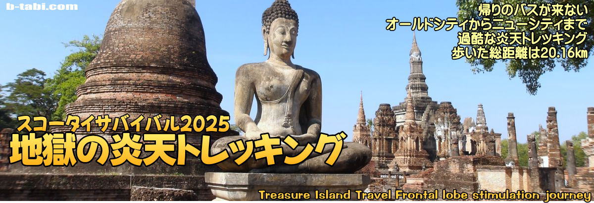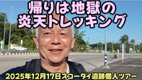 2025年12月17日 ピッサヌロークから日帰り訪問でスコータイ遺跡ツアー。帰りのバスが来ないので遺跡入口からバスターミナルまで12㎞を炎天トレッキング。終バスに間に合うのか?