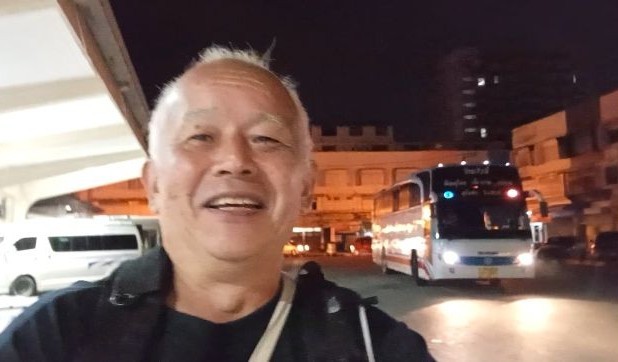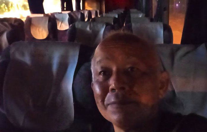 ピッサヌロークまで59バーツ。なんとこの終バスの乗客は私ひとり。夕日浴びでスコータイバスターミナル出発。車内で暗くなるなる中、車内でパソコンでページ制作。73㎞先のピッサヌロークへ40人乗りバスにたった一人乗って生還する。