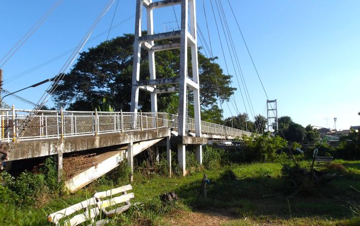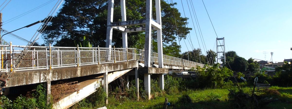 ナーン川にかかるピチット吊り橋 町の中心部から駅にはこの幅2m(車は通れない)のつり橋でしか行けない。3㎞大回りすれば車の通れる橋はあるんだけど。