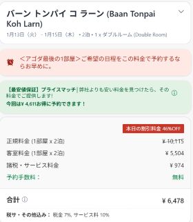 微妙なライン。最初は1泊400バーツくらいならと思っていたが、それなり快適。あと2泊くらいしてもいいかなと思い始めた。パタヤに戻ってもそこそこ小銭かかるし。カンボジアフライトまでの間、バンコクの独房宿で閉じこもるのも微妙。それなら小銭かかってもビーチでリゾート滞在のほうがよくねえか。日本が極寒の1月1泊3000円でリゾート滞在は十分格安になっているような気はする。ピッサヌロークの1泊65バーツ(320円)には確かに負けるけど。