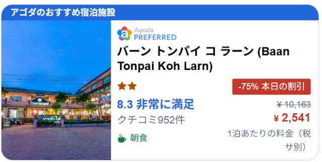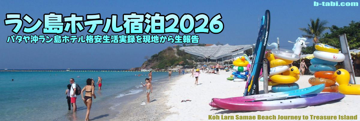 パタヤ沖ラン島にはホテルがたくさんあり快適な滞在生活ができる。ただ離島料金で物価が若干高い。特にホテル代が高く、1泊1000バーツ(5000円)前後になる。ただほとんど予約サイトから予約できる。コンビニも割増し料金になるが20Bが23Bになる程度。地元食堂もあり定食50バーツ~。レンタルバイク1日200B~。島の大きさは縦4.8㎞、横2㎞という程度だが急坂の山道が多い。ちなみに私はパタヤのホテルから予約サイト利用してキャンペーン予約して1泊640THB(3200円)だった。6:39