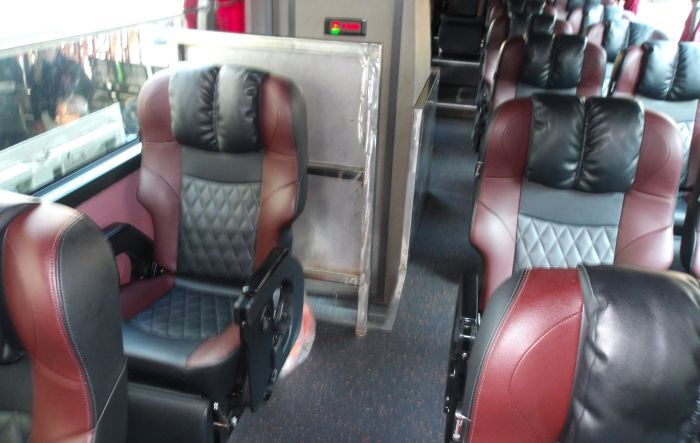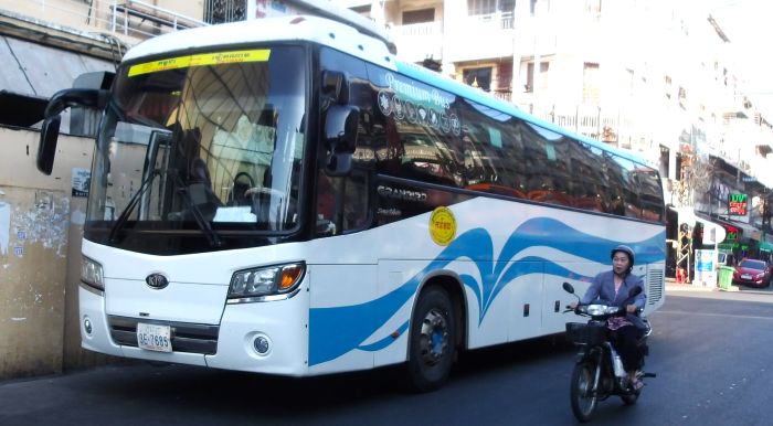 3列の豪華仕様のKIAバス。韓国は日本と逆、右側通行・左ハンドル。カンボジアとベトナムも韓国と同じ右側通行・左ハンドル。なので韓国車が席巻している。閑散道路でバイク運転していて反対車線逆走に気づいてあせる時がたまにある。