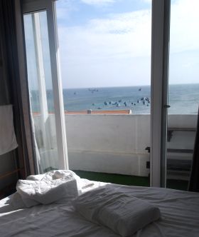 フークイ島の海の見える部屋で朝を迎える。テト3日目でこのホテルも地元客で混雑しているようで、さっき部屋を変えてほしいと宿のおじさんから申し入れがあり部屋を変えた。4階の海の見える部屋なのだがなんと4人部屋。カップル用に2人部屋をあけたかったみたい。海を見ながらのパソコンいじり環境はそのまま。
