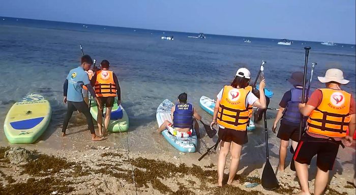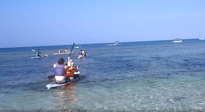 サップボードで沖まで自力で漕いでいく。私は2人乗りだった。沖でボートに乗りかえるのかと思ったたらそこがポイントだった。