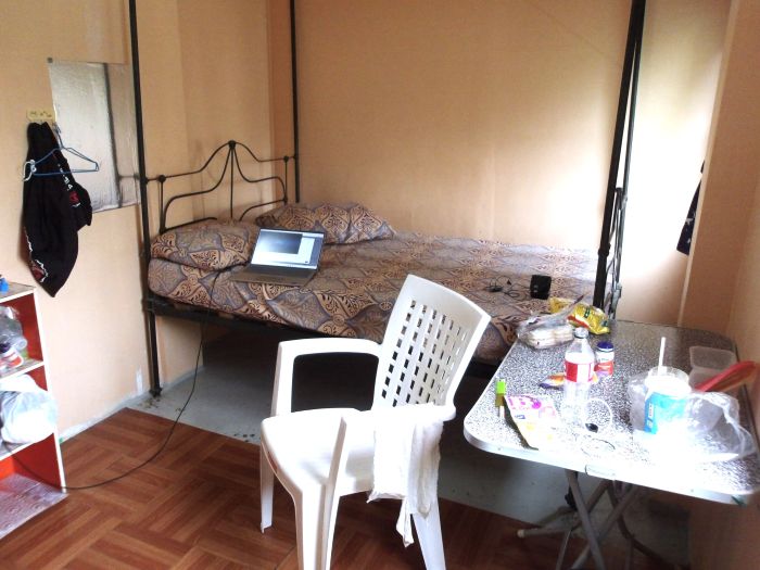 窓なし独房3畳部屋。隣の客の音楽が一晩中聞こえてくる。トイレシャワーも共同。騒がしいのでストレスたまる環境。
