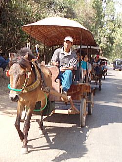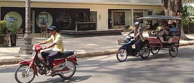 トゥクトゥクとは右写真の右側にあるような客席を付けたバイク。2人以上で利用する場合は自由度は減るが1人当たりは安くなる。トゥクトゥクを使って遺跡めぐりをする場合はこれを丸1日チャーターする。大回りコースを回って1日チャーター15$~、バンテアスレイを回っての1日チャーターで20$~。ベンメリア遺跡を回って1日チャーター30$~。2016年11月現在。