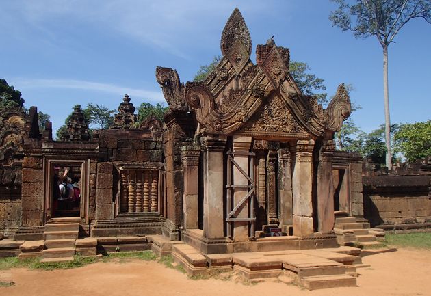 | またこれらの遺跡めぐりは思った以上に体力を使う。トゥクトゥクで連れて行かれるのは遺跡の前まででそこから遺跡の中までは徒歩で回る。また遺跡の最上階へ急な階段を両手両足を使ってよじ登ったりしている間に夕方を待たずに結構ヘロヘロになる。1月2月に行っても日本の真夏と変わりない暑さ。土ぼこりも体力を奪う。夜明けのアンコールワットを見る場合にはまだ暗いうちからホテルを出ないといけないので、そういう場合は睡眠不足も重なって余計に疲れがたまる。 私の場合は通しで夕方まで遺跡めぐりすると次の日まで疲れが残るので、昼に1回シェムに戻って昼飯食ってお昼寝してから午後の遺跡めぐりに向かったりもした。 |