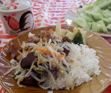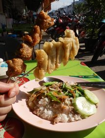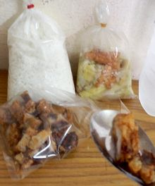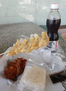 揚げ餃子22Bがうまい。たれ付。この餃子のたれが日本のものとほとんど変わらず異様にうまい。下の揚げたてフライドチキン15B、カウニャウ(もち米ご飯)5B。