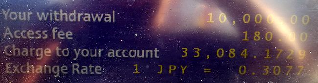 現地手数料のかからないイオンATMきのうから探しているがみつからない。仕方がないので宿近くのデパートに張り付いている現地銀行のATMでバーツを下ろす。するとなんと現地ATM手数料が150Bから180Bになっていた。手数料の影響少なくするために1万バーツ下ろす。レシートには元金に手数料が含まれる形で極悪レートで計算された日本円表示あり。これに別途カード会社の金利がかかるのか。 ATMと現金両替の比較のために近くのツアー会社で現金レート確認する。1万円両替して3050THBという。先の1万バーツレシート表示の日本円から計算すると1万円=3030Bにしかならず。この段階で現金両替より1万円あたり20B損になる。 |