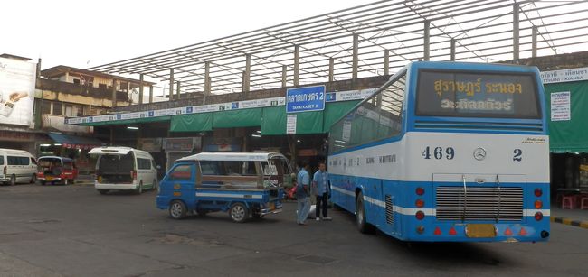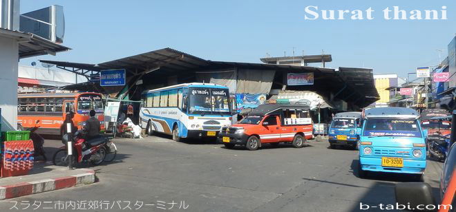 料金は高くもっとも早いのがロットゥー(ミニバンバス)550B、所要7時間。今日私が当たったツアー会社では毎日2本11時半、13時半に出て当日夜までにはバンコクに着くという。乗場は郊外の長距離バスターターミナルでなく下写真の市内南方面行バスターミナル脇。スラタニにはバスターミナルが複数ある。事前予約すれば宿前ピックアップしてくれるという。道がよくカーブがないのでロットゥー(ミニバンバス)は時速140kmでとばす。バスは時速80~100km。またそれ以外にも一気にバンコクに行かずにチュンポーンやホアヒンで宿泊しながらゆるゆるという選択もある。どれにしようか現在検討中。