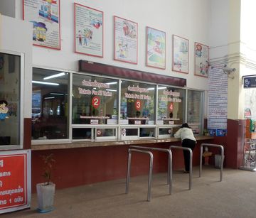 宿を後にバス通りに出て歩くこと1分でバスをつかまえてスラタニ鉄道駅へ。中学校の前で延々停車したり必要以上の徐行運転をするので時間がかかる。12kmなのに所要40分。最近スラタニ郊外にセントラルプラザ、ロビンソンやテスコロータスなど大型ショッピングモールがいくつもできていてバスはそこも経由する。 鉄道駅について早速プラチュアップキーリーカーン行き最安がいくらになるかたずねる。パスポート見せろという。何で鉄道チケットにパスポートを?すると「ラッキーだ。すぐ次の列車が来る。プラチュアップキーリーカーンまで460Bだ」と窓口職員。 |