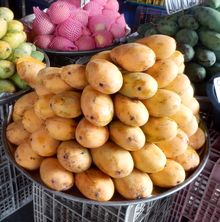 1kg45バーツのマンゴー。タイの方は完熟より青めのほうが好き。なので完熟のほうが安い。