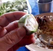 上の写真と使用状況を見る限り丸ナス(タイ語でマクーアプロ)ではないかと思われます。グリーンカレーに必ずと言っていいほど入ってるヤツです。