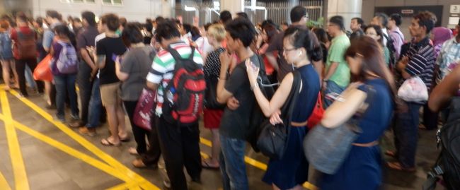 行きの総所要はイミグレ通過含めてジョホールバルの宿からシンガポールのクイーンズストリートまで50分、2.7リンギ。帰りは写真下のような通勤ラッシュに巻き込まれて1時間半かかった。シンガポールのコンビニのコーラが2.4シンガポールドル(200円)。安そうなホテルあたっても1泊1万円。ジョホールバルに宿泊して正解だったかも。
