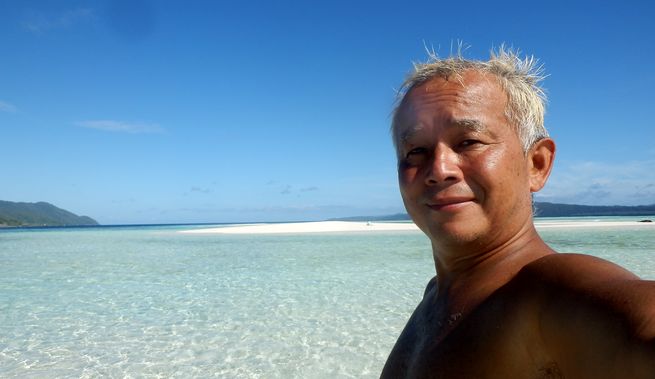 現在宿泊中の宿のご主人マーテン Marthen おじさん。生まれも育ちもラジャアンパットだが英語を話す。6月25日のラジャアンパット個人ツアーは客は私一人だが、ガイドとしてマーテンおじさんとボートの船頭さんの3人体制。4時間の島巡りツアーで40万Rp’(3400円)。シュノーケルギア1日レンタル5万Rp。